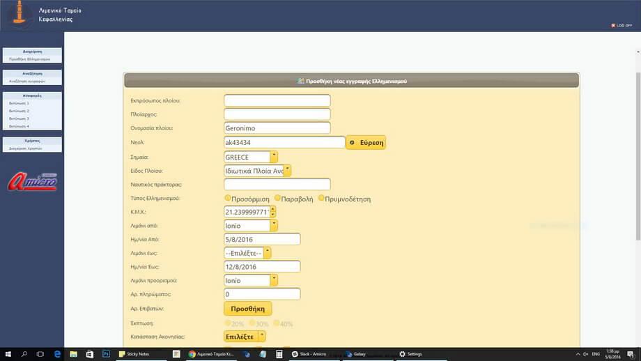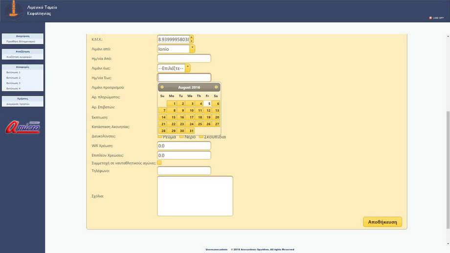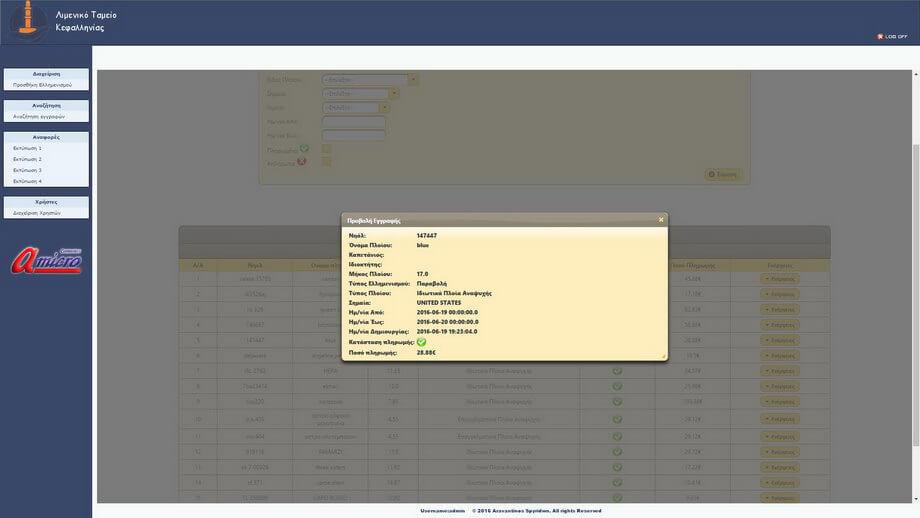 Συγκεκριμένα πρόκειται για Σύστημα Ελλιμενισμού και Καταγραφής σκαφών από φορητές συσκευές (tablet με συνδεση 3G) με διατήρηση βάσης δεδομένων στοιχείων και τιμολόγησης. Το σύστημα επικοινωνεί σε πραγματικό χρόνο, μέσω διαδικτύου με την κεντρική βάση δεδομένων και ελέγχει την ταυτότητα του σκάφους ή επιτρέπει την καταχώρηση του, υπολογίζοντας ταυτόχρονα το κόστος (σύμφωνα με το χρονικό διάστημα και τα τεχνικά χαρακτηριστικά του σκάφους) και εκδίδει επί τόπου απόδειξη.